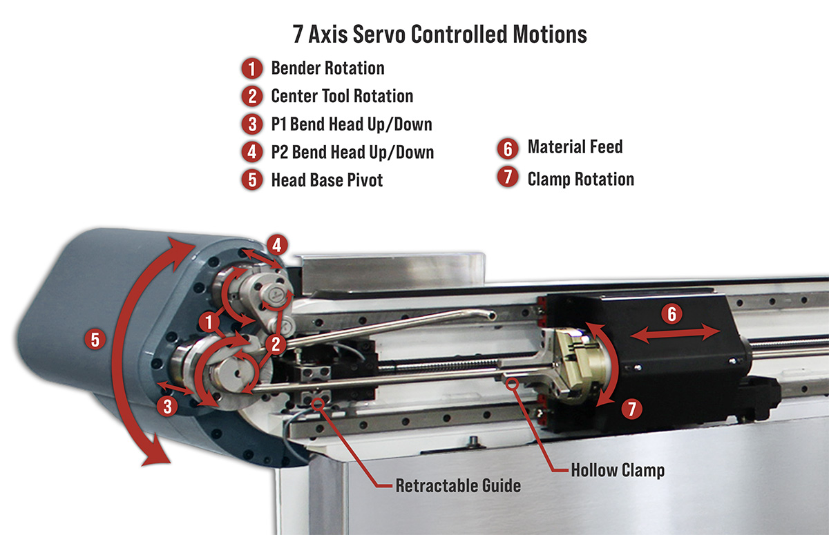 • Hollow clamp pneumatically grips the material and allows for controlled x-axis motion to the bend head